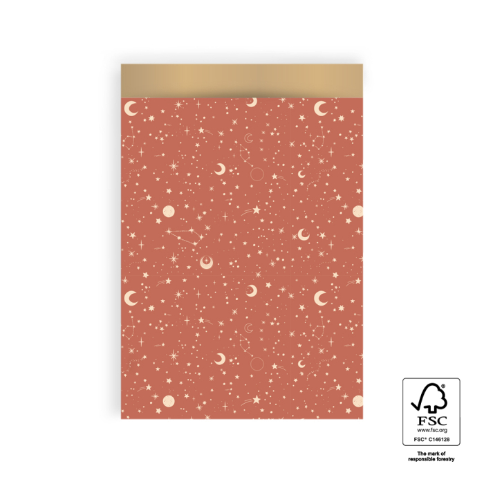 These flat flat bags feature a warm cognac starry sky design with pastel orange stars and moon, perfect for wrapping your gifts in style. Made from sustainable FSC®-certified paper, they come in various sizes to fit any present. The golden interior adds a touch of luxury and elegance. House of Products offers these bags, great to pair with matching stickers and ribbons. Give your customers a beautiful and eco-friendly packaging option that completes any gift. Order today and brighten your shop’s presentation with these atmospheric flat bags!