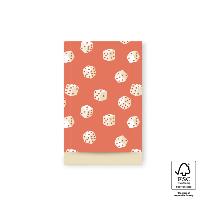 Give gifts a playful and modern look with the Game On - Light Biscuit flat bags. The front has a striking design with light dice on a powerful red background, giving the bag an energetic, cheerful and game-like character. The back in a soft light biscuit colour provides a stylish contrast and a surprising effect when opened. Thanks to the sturdy FSC-certified paper, the bags do not tear and you can work quickly with them at the counter. Packaged per 200 pieces: ideal for shops with many daily wrapping moments.