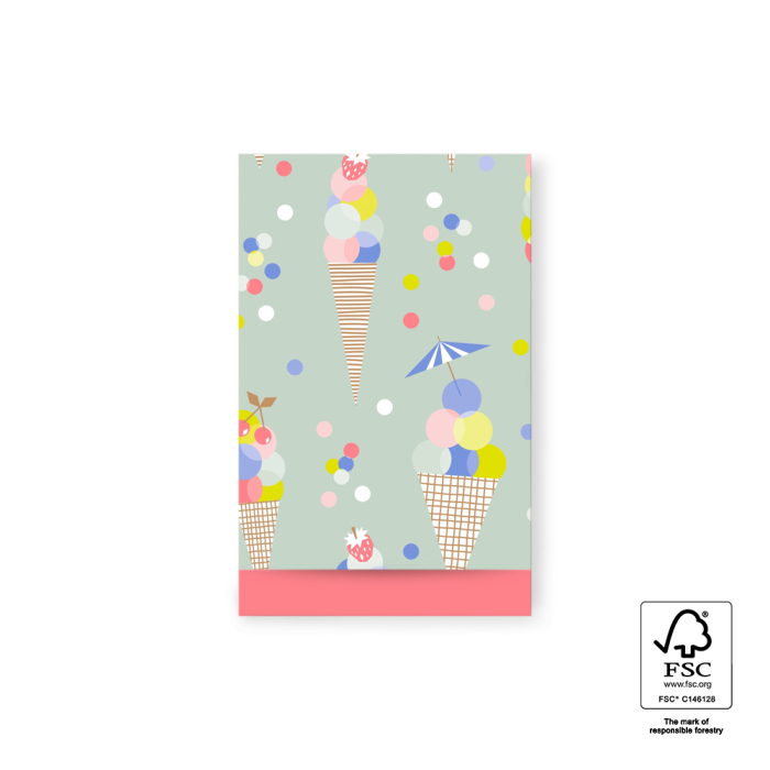 Bring summer vibes to your gift wrapping with House of Products' flat gift bags. Decorated with cheerful ice cream and confetti designs in salmon pink, blue, yellow, and white on a pastel green background, these bags are perfect for any occasion. The salmon-coloured interior adds a fresh, playful touch. Available in various sizes and FSC®-certified, they combine style and sustainability. Ideal for retailers looking to delight customers with unique and eco-friendly packaging. Complete the look by pairing these bags with matching ribbons and stickers for the perfect gift presentation.