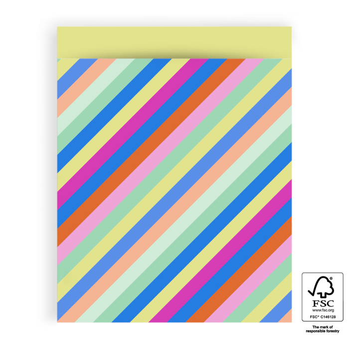 Add a touch of colour and cheer to your gifts with House of Products’ gift bags. These flat bags come in various sizes, making wrapping easy and stylish. The bold stripe design in pink, orange, blue, yellow, and light green is versatile and perfect for any occasion. The bright yellow interior adds a playful touch. Ideal for retailers looking for efficient and creative packaging solutions. Made from FSC®-certified paper, these bags offer a sustainable option without compromising on quality. Pair them with our stickers and ribbons for a complete gift-wrapping solution. Make your gifts truly unforgettable!