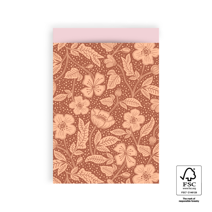 Discover the stylish gift bags from House of Products! These flat bags are practical at the counter and available in various sizes, perfect for small and medium gifts. The design features a natural flowers and leaves motif in warm tonal colours such as brown and orange. The light pink interior adds a subtle, delightful detail when opening. Ideal for retailers and online shops looking to offer customers high-quality and sustainable packaging. Pair the bags with matching ribbon or stickers for a festive, complete presentation. FSC-certified and sustainable, elegant for any occasion.