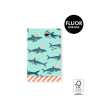 Make gift-giving more fun with the bold gift bags from House of Products. Featuring sharks in party hats with confetti on a light blue-green background, these bags are perfect for boys. The dark jade-blue sharks and fluorescent orange and yellow details add a striking touch. A fluorescent orange stripe inside adds a surprise element. Made from sustainable FSC®-certified paper, these flat bags are ideal for quick and neat wrapping. Available in various sizes, they offer an eco-friendly solution for retailers and online shops. Choose House of Products for stylish and environmentally conscious packaging.