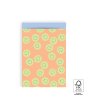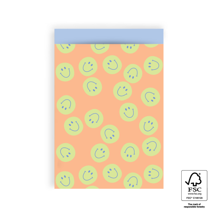Delight your customers with these flat gift bags from House of Products. The cheerful design features lime green smileys on an orange background, suitable for all ages. The blue interior adds a playful touch, making each bag extra festive. Available in multiple sizes, they are perfect for small gifts, treats or jewellery. The sturdy paper and flat design make them practical at the counter. Pair with matching ribbon or stickers for a complete, joyful presentation. FSC-certified and sustainable, ideal for retailers and online shops.