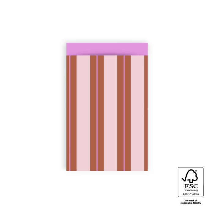 Cheerful and colourful gift bags from House of Products! The flat format makes them perfect at the counter and suitable for different gift sizes. The design features wide stripes in brown and light pink, with a narrow hot pink accent stripe, giving a playful and lively look. The pink interior adds a fun detail when opening the bag. Available in multiple sizes, ideal for gifts, treats or small surprises. Pair with matching ribbon or stickers for a complete festive presentation. FSC-certified and sustainable, perfect for retailers and online shops.