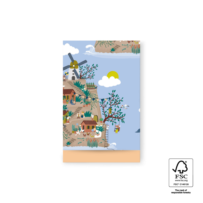 Add an enchanting touch to your gifts with House of Products' delightful gift bags. This unique design features a detailed world of charming scenes in natural tones. The soft blue background, enhanced with taupe, green, yellow, and cognac accents, creates a warm and serene feel. The peach-coloured interior adds a lovely finishing detail. Ideal for children’s celebrations or as elegant packaging in your store or webshop. These flat bags are available in various sizes, perfect for quick and tidy wrapping. Made from sustainable FSC®-certified paper, they offer an eco-friendly and stylish choice. Wrap your gifts beautifully with House of Products!