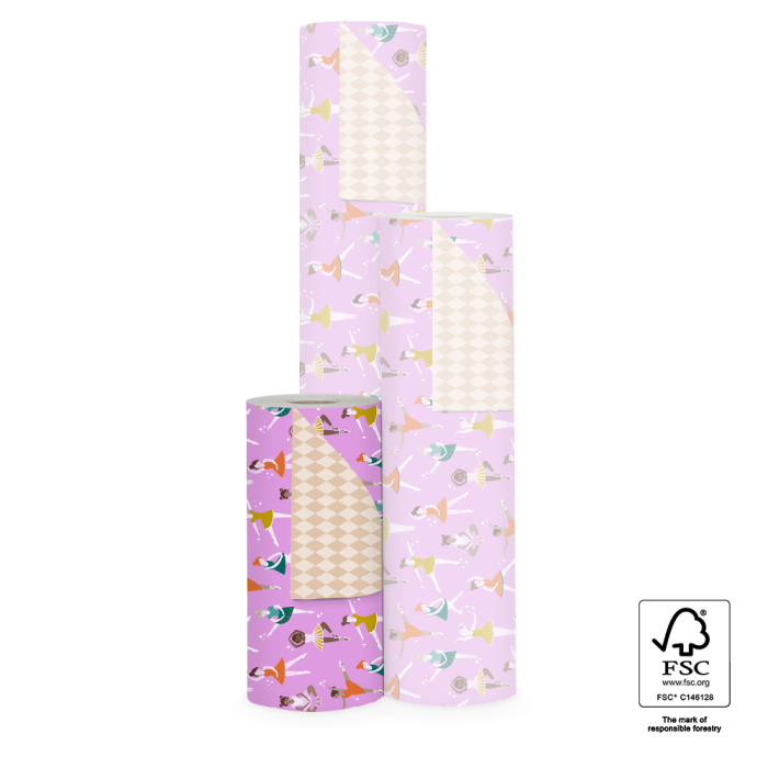 This 150-metre wrapping paper roll is perfect for packaging gifts for girls. The design features adorable ballerinas in tutus on a soft pink background, with accents of ochre yellow, jade green and orange. The reverse side has a subtle beige harlequin print - a sweet finishing touch. FSC®-certified and sustainably made, this paper is ideal for children’s gifts, birthdays or baby boutiques. Combine with matching ribbons and stickers from House of Products for a full gift-wrapping experience. Wrap with style and care - we provide the charm, you add the magic.