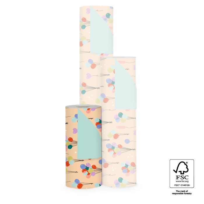 Make gifts extra festive with this 150-metre counter roll wrapping paper. The cheerful design features colourful balloons in blue, yellow, green, pink and orange on a soft peach background, perfect for children and young adults. The pistachio-coloured reverse adds a playful, complete finishing touch. The strong and smooth paper rolls out easily, ideal for daily use in your shop or behind the counter. Combine with matching ribbon or stickers for a professional and festive presentation. House of Products supplies sustainable, stylish packaging for retailers and webshops who want to offer quality.
