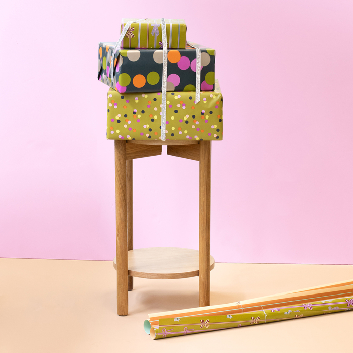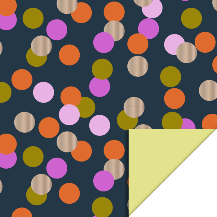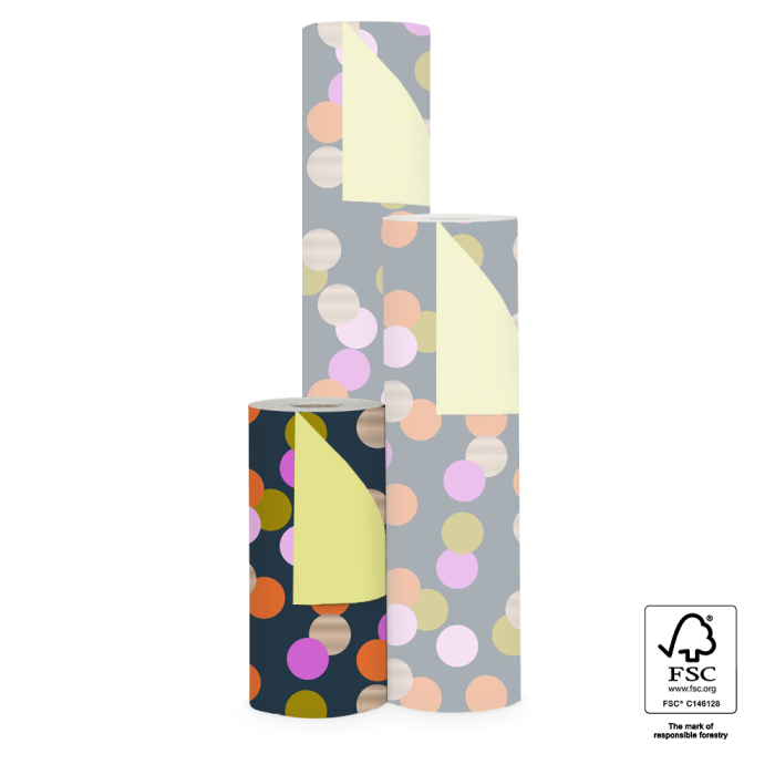 Add a festive touch to your shop’s gift wrapping with this 150-metre counter roll from House of Products. Featuring a playful confetti design with large dots in orange, pink, olive green and metallic beige on a dark blue background, this FSC®-certified paper is both eye-catching and sustainable. The light yellow reverse adds a stylish detail. Ideal for retailers who want to impress their customers with beautiful, eco-friendly packaging. Combine with matching ribbons and stickers for the full unboxing experience. Order now for gift wrap that’s good for the planet and perfect for your store.