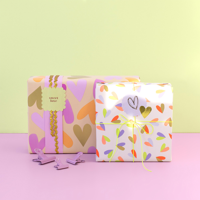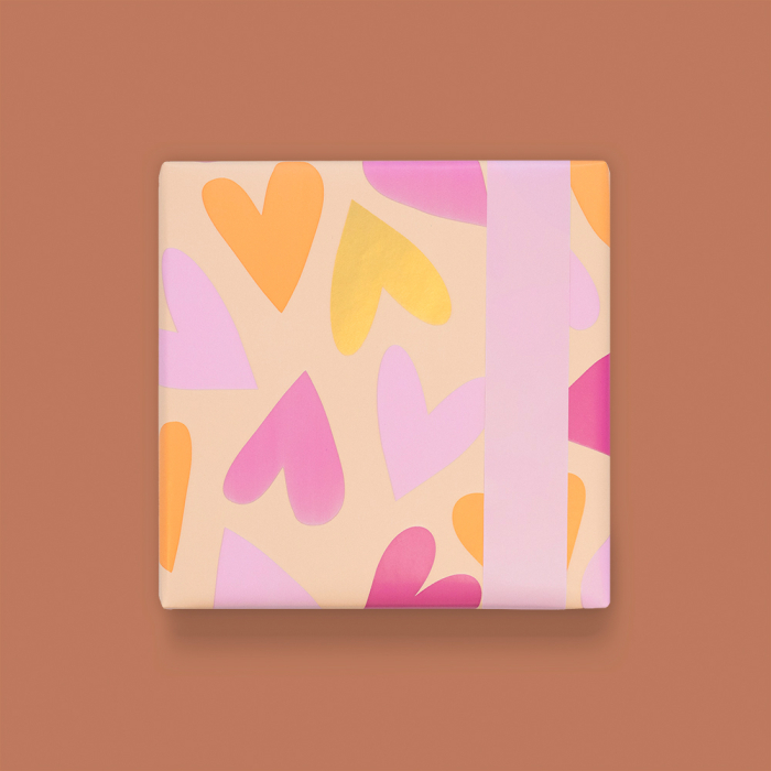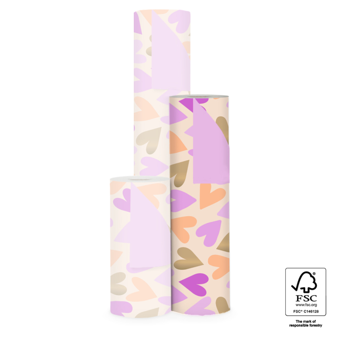 Delight your customers with beautifully wrapped gifts using this 150-metre counter roll wrapping paper. The design features large hearts in light pink, dark pink, orange and gold on a nude background. The pink reverse adds a soft, warm finishing touch. The strong and smooth paper rolls out easily, perfect for daily use in your shop or behind the counter. Ideal for Valentine’s Day, weddings, birthdays or other special gifts. Combine with matching ribbon or stickers for a complete romantic presentation. House of Products supplies sustainable, stylish packaging for retailers and webshops.