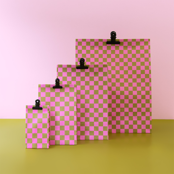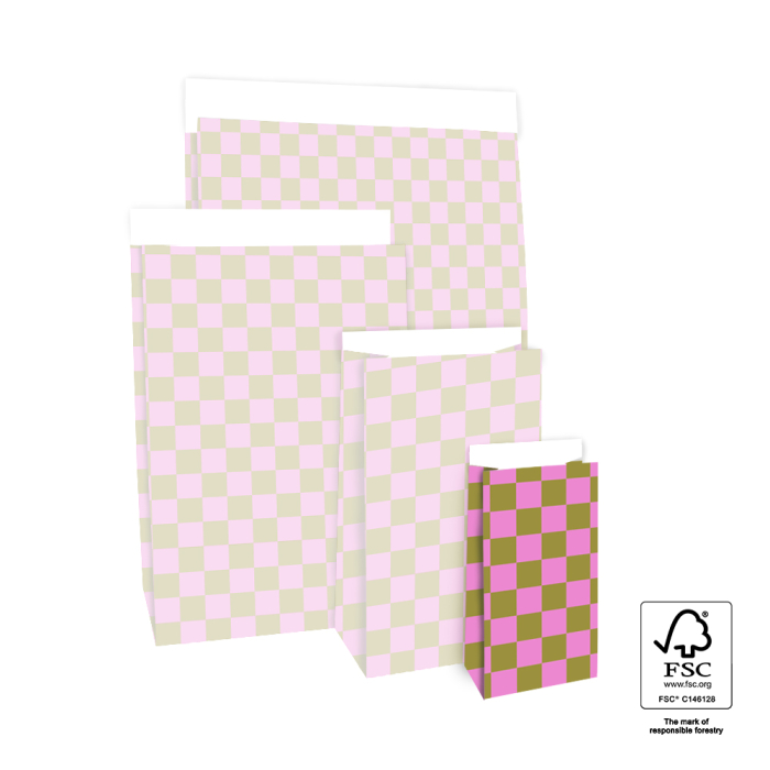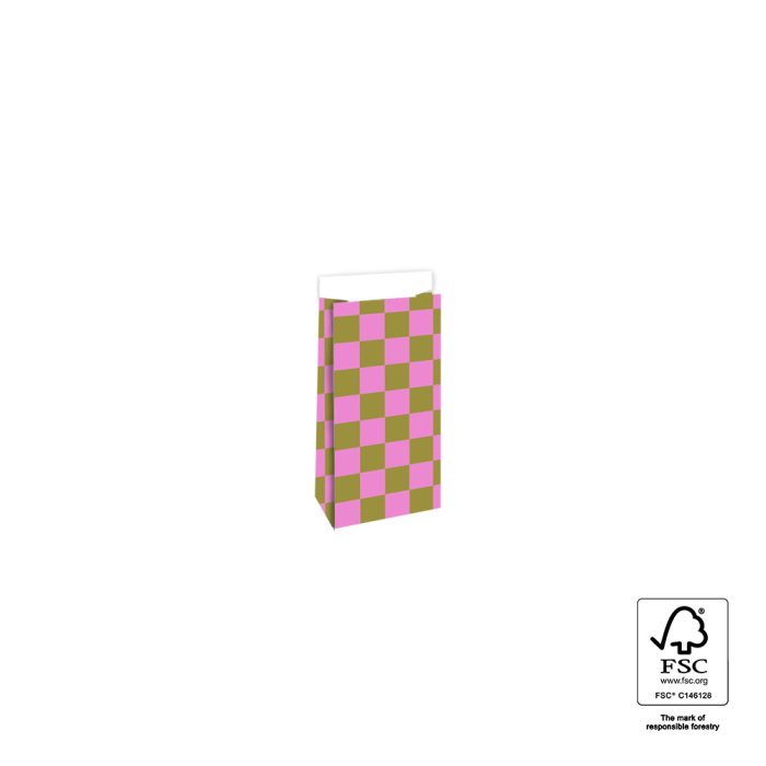 Give your gifts a playful look with our Check block bottom bags in olive green and pink. Perfect for quick and easy wrapping of gifts. These block bottom bags come in 4 sizes, all featuring a convenient closure flap. Seal with a sticker or office clip and be amazed at how quickly and luxuriously you can wrap with these high-quality, FSC® certified block bottom bags. The flap of this block bottom bag is 2 cm.