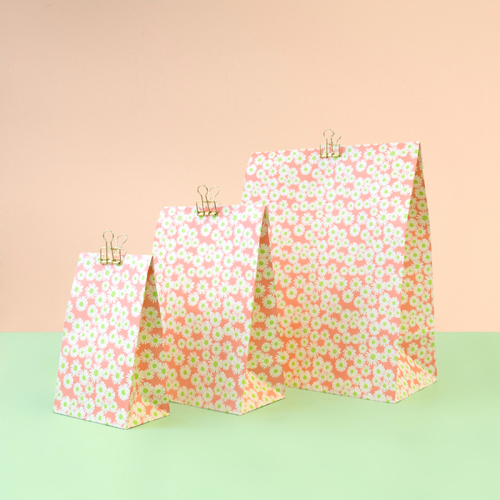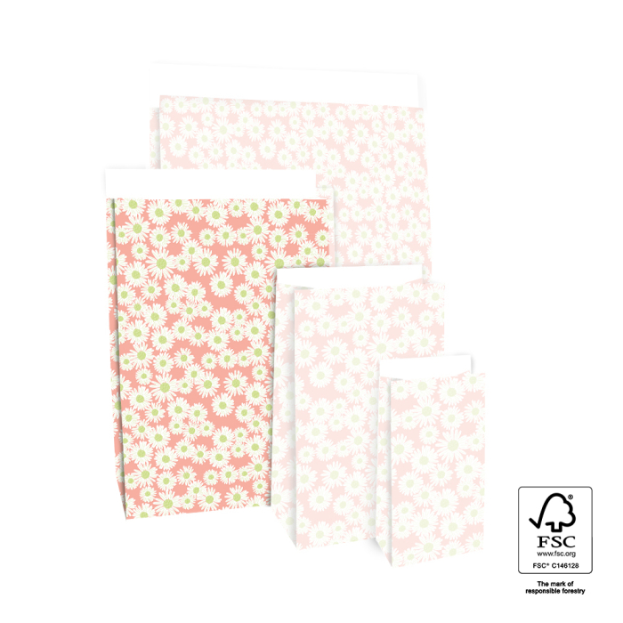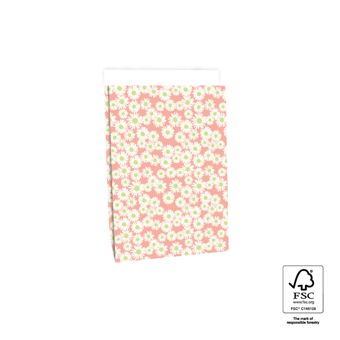 Our block bottom bags Daisy Salmon in medium size 17 x 10 x 25 cm make every medium gift festive. The cheerful design with daisies on a salmon pink background gives a playful and charming look. The spacious block bottom provides enough room for medium gifts and the 3 cm flap closes easily with a sticker or paperclip. Made from FSC® certified paper for sustainable quality and professional presentation. Perfect for shops and online stores wanting stylish and festive packaging.