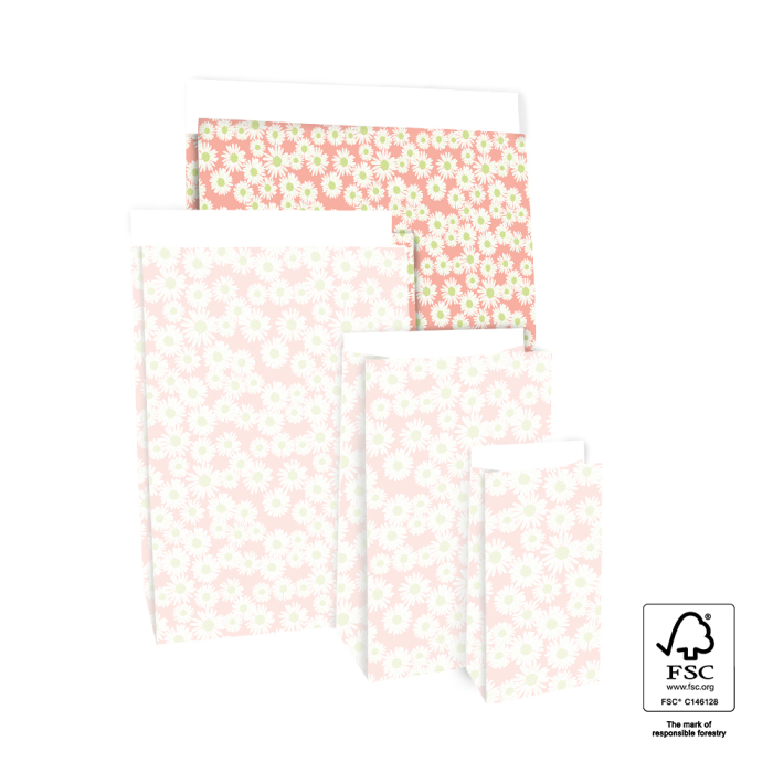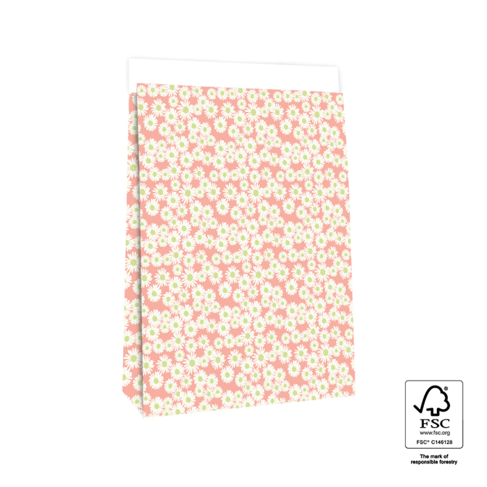 For larger gifts our block bottom bags Daisy Salmon in large size 27 x 15 x 34 cm are ideal. The cheerful daisy design on a salmon pink background gives a festive and eye-catching look. The spacious block bottom ensures the bag stands firmly and the 4 cm flap closes easily with a sticker or paperclip. Made from FSC® certified paper these bags provide sustainable and high-quality packaging. Perfect for shops and online stores wanting a cheerful and festive presentation for larger gifts.
