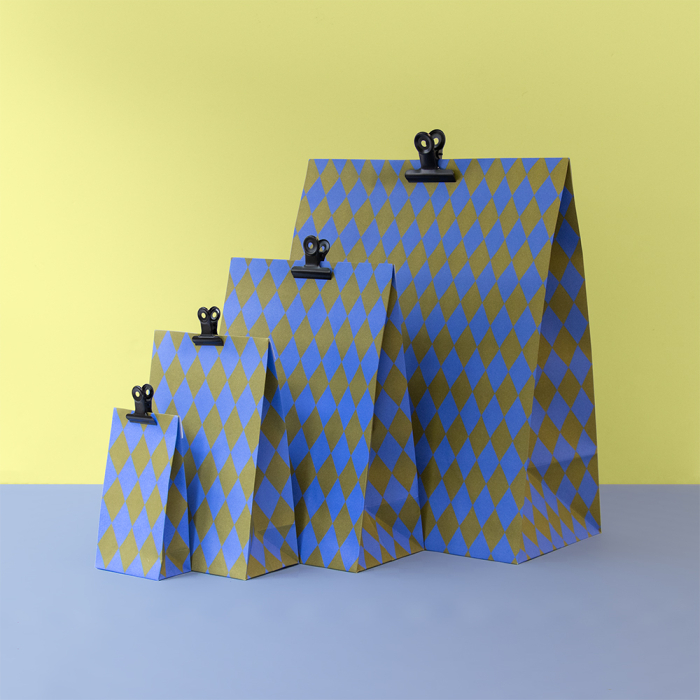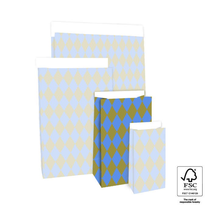 Add a touch of cheer to your packaging with our Harlequin block bottom bags in olive green and blue. Perfect for small gifts. These block bottom bags are available in 4 sizes, all featuring a convenient closure flap. Seal with a sticker or office clip and be amazed at how quickly and luxuriously you can wrap with these high-quality, FSC® certified block bottom bags. The flap of this block bottom bag is 2 cm.