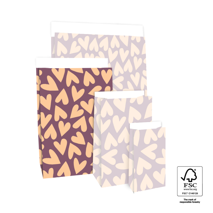 Wrap your gifts with love using our Hearts block bottom bags in beetroot red and peach. Perfect size for medium-sized surprises. These block bottom bags come in 4 sizes, all featuring a convenient closure flap. Seal with a sticker or office clip and be amazed at how quickly and luxuriously you can wrap with these high-quality, FSC® certified block bottom bags. The flap of this block bottom bag is 3 cm.