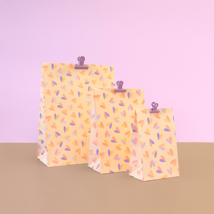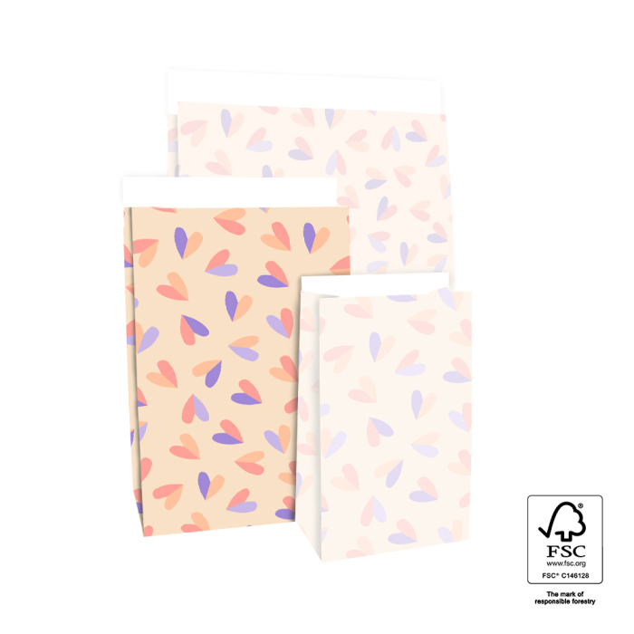 Make gift wrapping a joy with our block bottom bags - Hearts Duo Sweet, Medium (17 x 10 x 25 cm). These versatile bags are perfect for quickly wrapping gifts. The 3 cm flap closes easily with a sticker or paperclip. Made from FSC® certified material, they provide quality and sustainability. The cheerful Hearts Duo Sweet design makes any gift look attractive. Ideal for medium-sized gifts such as sweets, small toys, or care products. A sustainable and stylish choice for your shop or webshop.