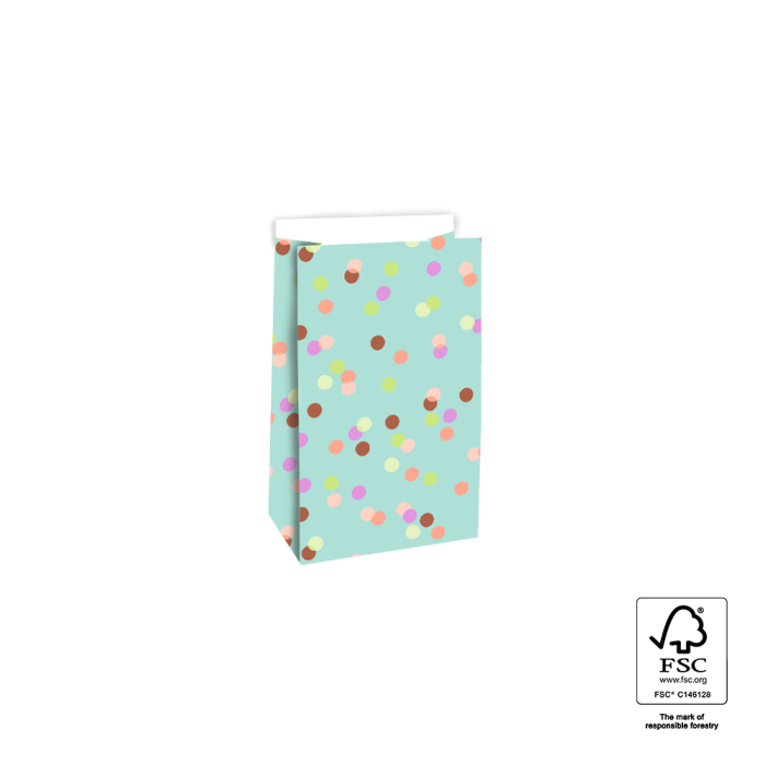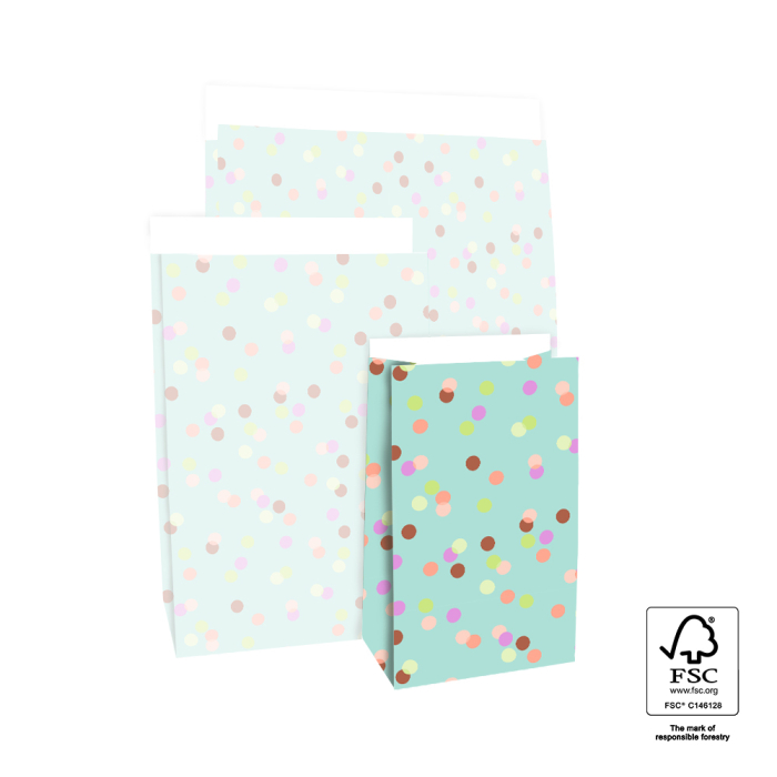 Make every gift festive with our block bottom bags Party Confetti Pistache in small size 12 x 7 x 19 cm. The cheerful design with colourful confetti on a pistachio background gives a vibrant and celebratory look. The sturdy block bottom keeps the bag upright and the 2 cm flap closes easily with a sticker or paperclip. Made from FSC® certified paper these bags provide sustainable and premium packaging, perfect for shops and online stores wanting an original festive presentation.
