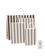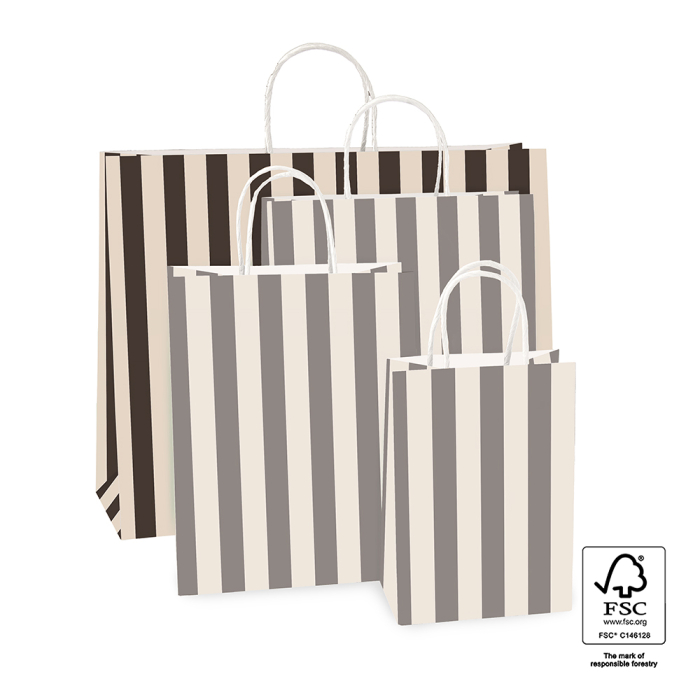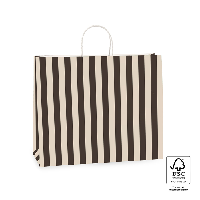 Sturdy FSC® certified paper carrier bags with twist cord in black/beige stripe. Available in 4 sizes, this is the largest. Personalize these sustainable bags with a sticker or gift tag on the handle.