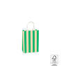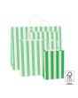 Sturdy printed FSC®-certified paper carrier bags with twist handles. Printed with a broad stripe in green and peach. Available in 4 sizes, this one is the smallest. Personalise these versatile and sustainable bags with a sticker on the bag or a gift tag on the handle.