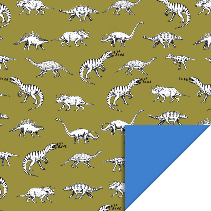 For your store, our 150-meter counter roll of wrapping paper is a must-have for boys. Featuring a cool design of dinosaurs on an olive green background, this wrapping paper is perfect for wrapping gifts for adventurous boys. The blue reverse side adds a cool touch to the packaging. Whether it's birthdays, holidays, or special occasions, this wrapping paper will surely make an impression. Sustainably produced and FSC® certified, this aligns perfectly with your company's values. Order now from House of Products!