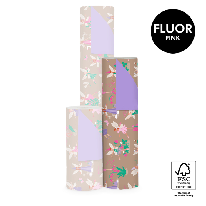 Enchant your customers with our Counter Roll Wrapping Paper from House of Products! Specially designed for girls up to 12 years, featuring fairies, pink and purple details, and flowers on a taupe background. This 150-meter roll is perfect for retailers aiming for quality and sustainability. The purple reverse adds a touch of magic to the wrapping process. FSC®-certified and eco-friendly. Order today from House of Products and give your gift packaging an enchanting touch!