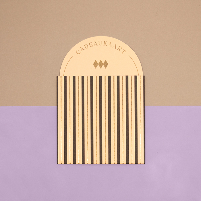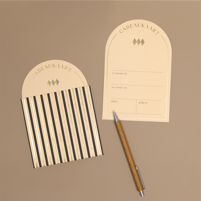Give your gift cards a stylish upgrade with our Stripe Gold giftcards (set of 15). Each card features a sleeve in an elegant stripe design in black, pastel peach, and subtle gold foil lines, plus a matching insert with English text. Made from sturdy FSC®-certified paper, the card feels luxurious and high-quality - perfect for shops and online stores. Ideal for presenting gift cards professionally and festively. Combine with wrapping paper or ribbon for a complete packaging solution.