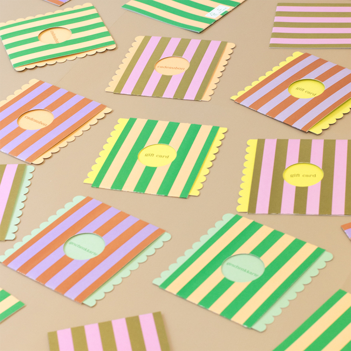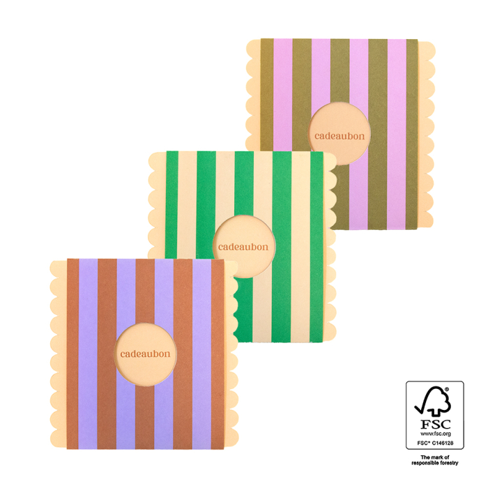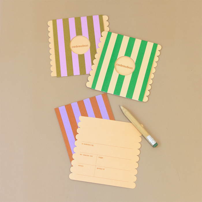 A set of 15 stylish gift cards with a striped design and Dutch-language text. These cards are ideal for packaging and giving gift vouchers in your shop or webshop. The scalloped edge, colourful design and sturdy FSC®-certified material create a playful yet luxurious look. A practical and beautiful solution for your gift range.