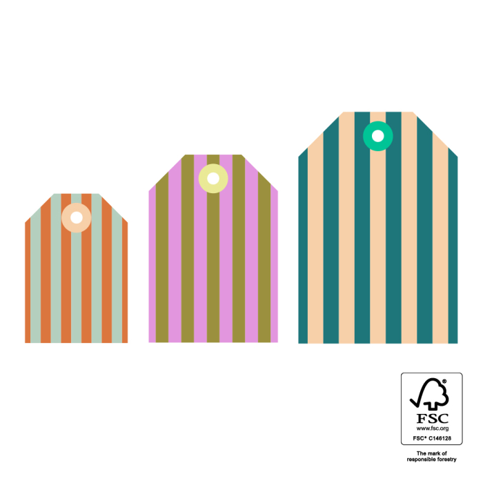 Add a stylish finishing touch to any gift with this set of striped gift tags in three sizes (S-M-L). The timeless design matches beautifully with various wrapping styles. Perfect for shops and webshops wanting to elevate their packaging game. Printed on FSC® certified paper, these tags combine design and sustainability. Mix and match with ribbons or stickers from the House of Products collection for a cohesive look. A packaging essential you’ll want to keep within reach!