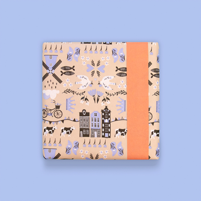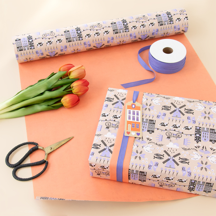 Give your gifts a Dutch touch with this 150-metre counter roll. The design features windmills, clogs, and tulips in dark grey, white, and blue on a beige background. The orange reverse adds a fresh, striking finishing touch. The strong paper rolls out smoothly, ideal for daily use in your shop or webshop. Perfect for wrapping gift sets, souvenirs, or themed presents. Combine with matching ribbon or stickers for a professional presentation. House of Products supplies sustainable, FSC-certified, high-quality wrapping paper, specially designed for retailers and webshops.