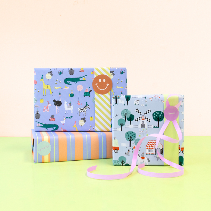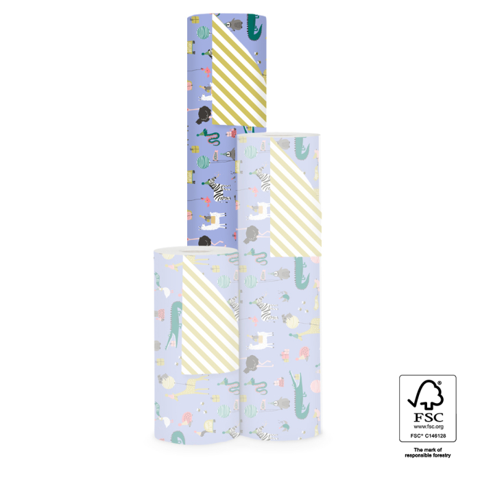 Make children’s parties even more fun with this 150-metre counter roll wrapping paper. The cheerful design features party animals, balloons and gifts on a blue background, giving every gift a joyful look. The yellow stripe on the reverse adds a playful finishing touch. The strong and smooth paper rolls out easily, perfect for daily use in your shop or behind the counter. Ideal for birthdays, party favors or gift sets for children. Combine with matching ribbon or stickers for a complete festive presentation. House of Products supplies sustainable, stylish packaging for retailers and webshops.