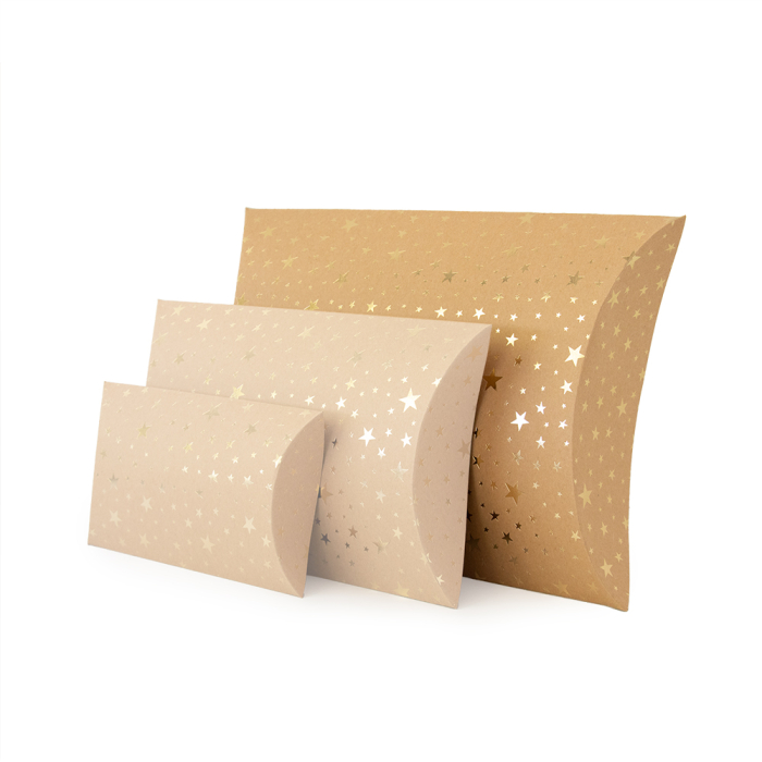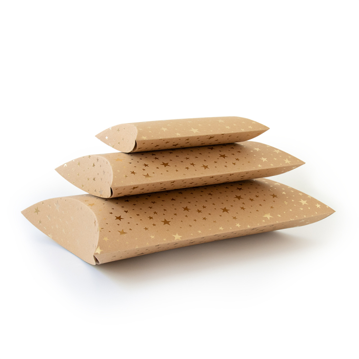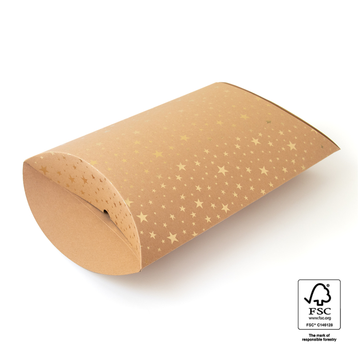 Make an impression with our Craft Golden Stars pillow boxes (30 pieces). Made from durable Kraft paper with beautiful golden stars. Cushion boxes are ideal for packaging gifts, such as jewelry, small accessories, cosmetics, and more. They add an extra layer of elegance and luxury to the gift. Order today at House of Products, your sustainable partner for wrapping paper, stickers and ribbon.