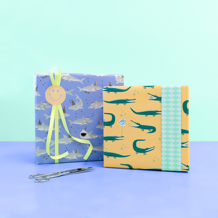 Make gifts for adventurous boys extra festive with this 150-metre roll. The design features silver sharks with party hats and confetti on a blue background, with salmon details. The reverse with salmon stripe adds playfulness. Strong paper, ideal for birthdays and children’s parties. Combine with ribbon or stickers. House of Products supplies sustainable, stylish packaging.