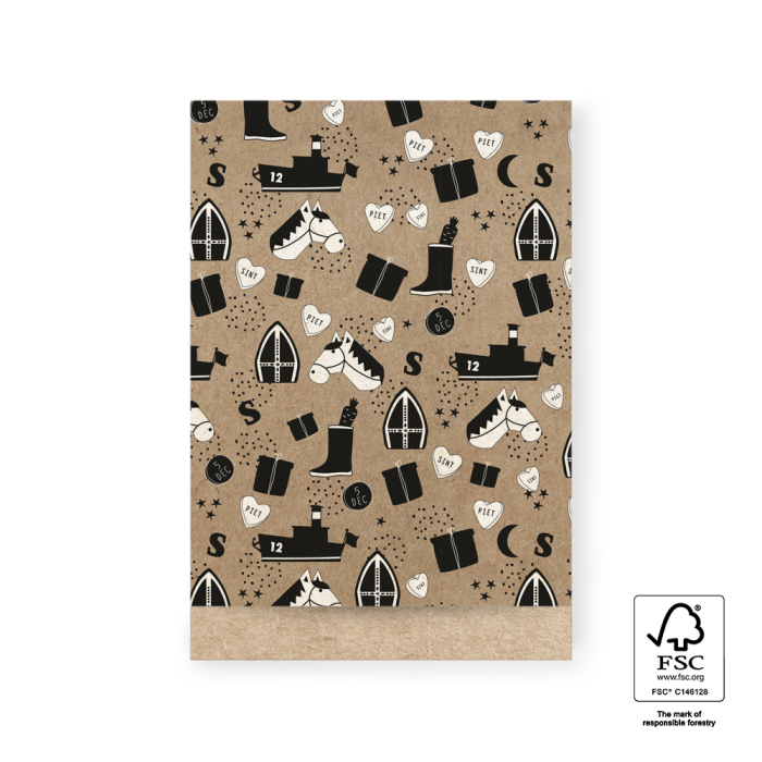 Give your gifts a natural and festive look with these flat flat bags made from brown kraft paper, printed with a charming Sinterklaas design in black and white. Available in various sizes, these bags offer the perfect fit for any present. Made from sustainable, FSC®-certified paper, they are an eco-friendly alternative to traditional packaging. Ideal for retailers and online shops looking to offer something special for the Sinterklaas celebration. Pair them with matching wrapping paper, ribbons, or stickers from House of Products for a complete festive presentation.