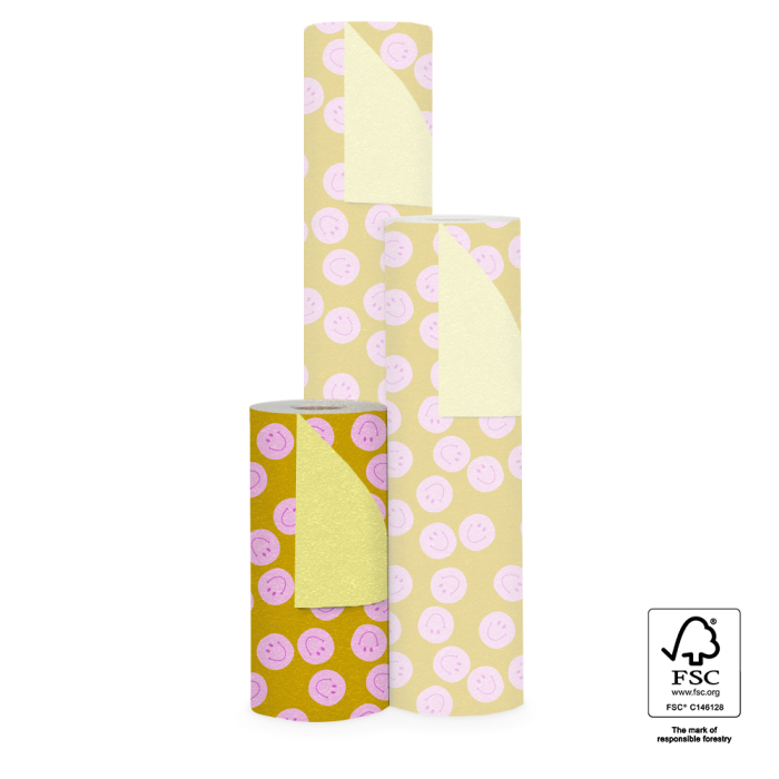 Spread joy with this 150-metre counter roll from House of Products. The cheerful design features light pink smiley faces on an olive green background - playful, fresh and perfect for any age. The pale yellow reverse adds a soft finishing touch. FSC®-certified and sustainably made, it’s ideal for shop owners who want to wrap gifts with personality and purpose. Great for birthdays, parties or spontaneous surprises. Combine with our matching ribbons and stickers for a complete packaging look. Order online today and bring smiles to your shop’s gift wrapping with this happy, eco-conscious paper.