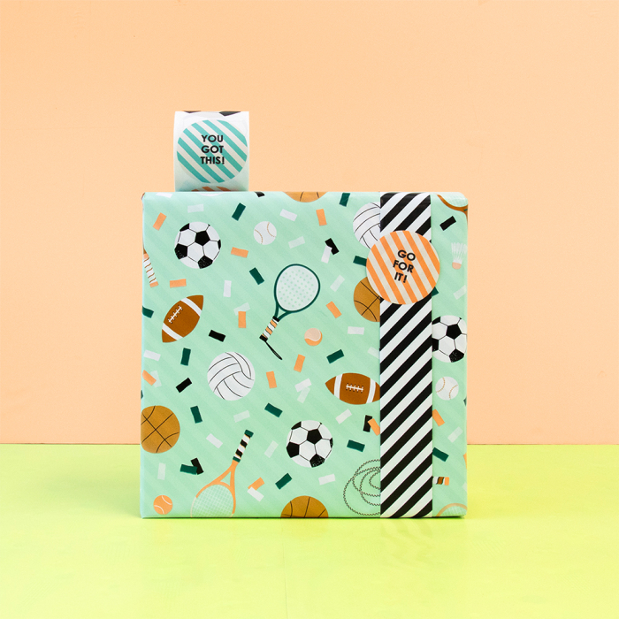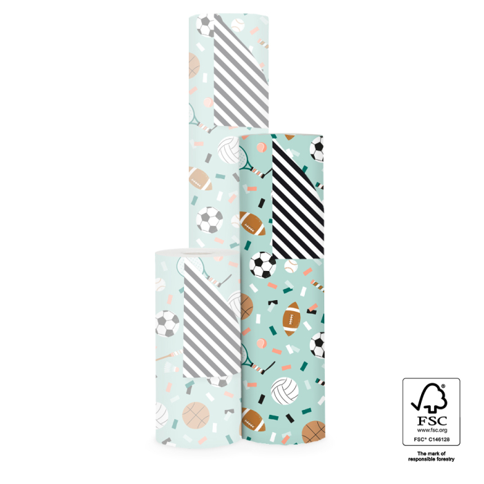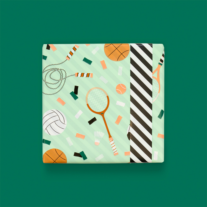 Wrap your gifts in style with this 150-metre counter roll wrapping paper. The sporty design features balls, tennis rackets, jump ropes and playful confetti on a pistachio background, with colours in brown, orange, jade green, white and black. The black reverse adds a modern touch. Perfect for sporty children and adults alike, this strong and smooth paper rolls out easily, making it ideal for daily use in your shop or at the counter. Combine with matching ribbon or stickers for a complete and professional gift wrap. House of Products supplies sustainable packaging for retailers and webshops.