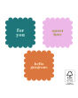 These Cookie Bright stickers add a cheerful and personal touch to your packaging instantly. The set includes 250 stickers (55 x 55 mm) with playful scalloped edges and three different texts: ‘for you’, ‘sweet love’, and ‘hello gorgeous’. In fresh jade green, pink, and cognac colours, they perfectly suit sustainable, stylish gifts. The entire product is FSC® certified, ensuring you choose quality and environmental care. Ideal for sealing gifts, envelopes, or orders and giving your packaging a unique finishing touch.