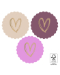 Add a sweet finishing touch to your packaging with our Heart Gold - Sweet stickers. These round Ø 55 mm stickers come on an FSC® certified roll of 250 pieces in three warm shades: beige, bordeaux and pink. Each sticker features a shiny gold foil heart - perfect for romantic, festive or heartfelt wrapping. Ideal for retailers and webshops looking for elegant and sustainable packaging solutions. Combine with wrapping paper, tissue or ribbon from House of Products for a luxurious look that shows you care.