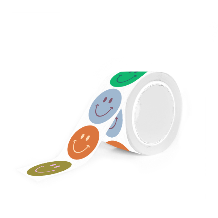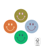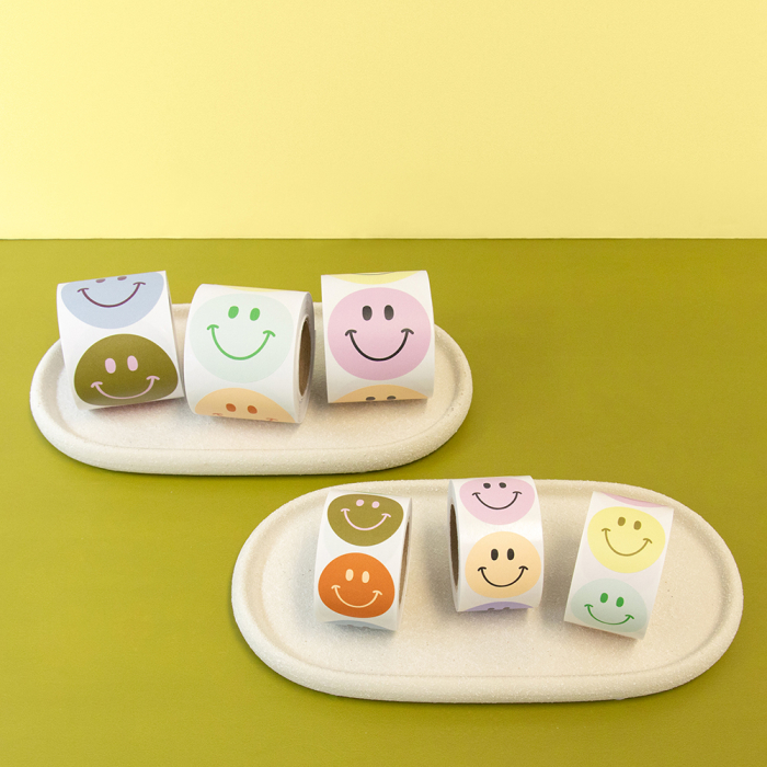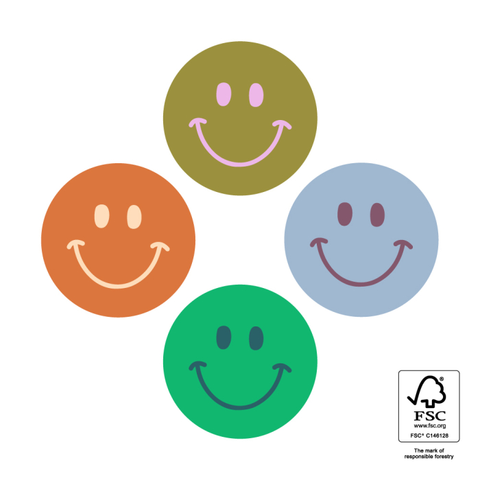 Add a happy touch to your packaging with our Smiley Mini stickers! This FSC® certified roll contains 250 round stickers (Ø 35 mm) featuring four playful smileys in bold colour combos: olive/pink, cognac/peach, blue/bordeaux and green/jade. These compact stickers are ideal for sealing envelopes, decorating parcels or finishing gift packaging. Their size makes them perfect for subtle but cheerful branding. Match them with ribbons or tissue paper from House of Products for a complete, fun, and eco-friendly package.