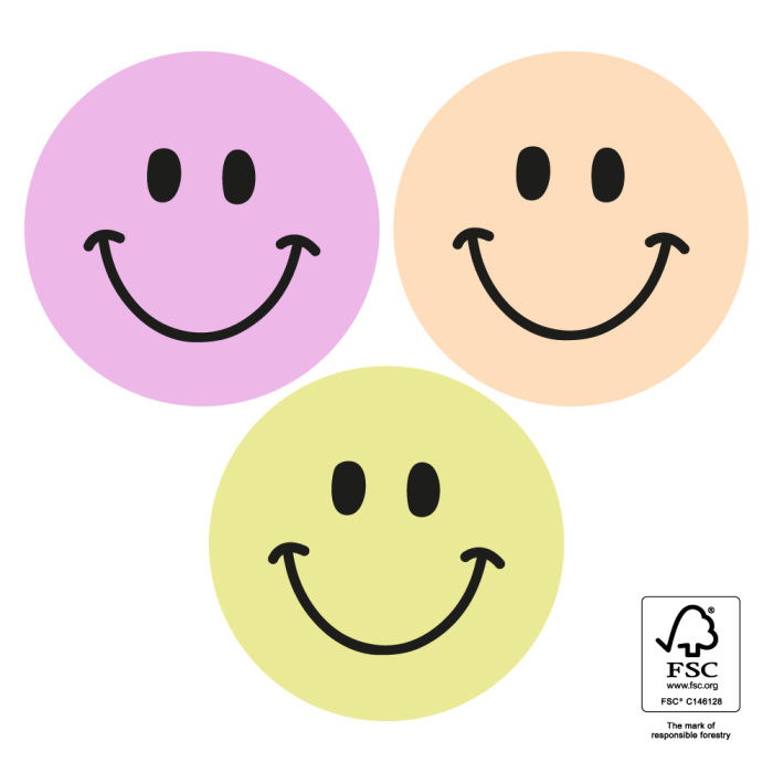 Make your packaging pop with the Smiley Sweet stickers! This FSC® certified roll includes 250 round stickers (Ø 55 mm) in pink, orange and yellow. Each features a sweet smiley in a bold black line drawing - simple, fun, and expressive. Perfect for packaging gifts, shipping boxes or envelopes. Add a cheerful finishing touch that makes customers smile. Great for webshops and stores that value stylish, sustainable packaging. Combine with matching tissue paper or ribbons from House of Products for a complete unboxing moment.
