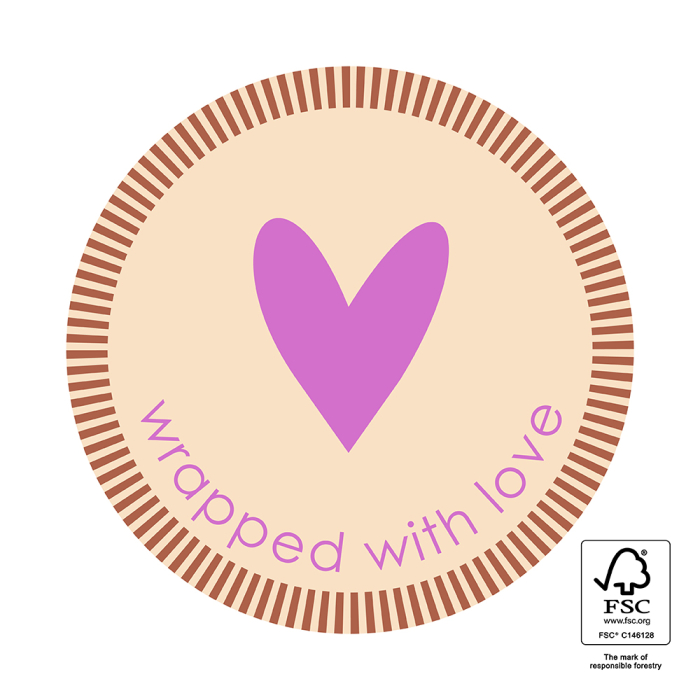 Add a loving finishing touch to your gifts with our stickers 'Wrapped with love'. FSC® certified and sustainably produced. The round Ø 55 mm stickers are perfect for bags, boxes, and paper. 250 pieces per roll, ideal to give your gift wrapping a personal and stylish look.