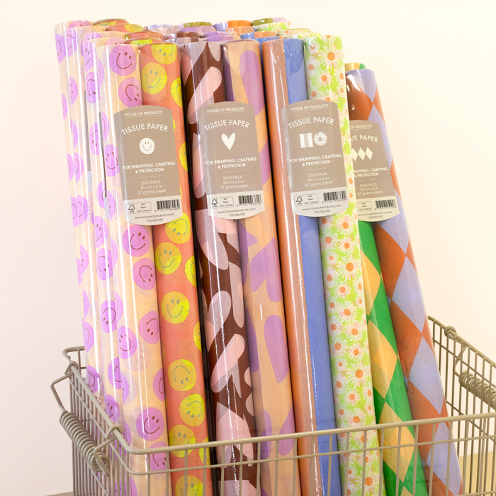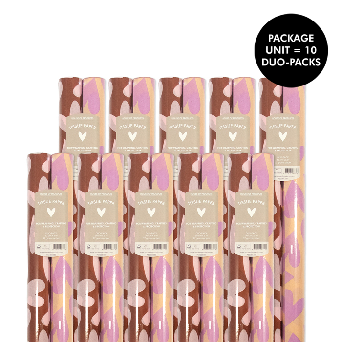 With this product, you can offer tissue paper as a consumer item in your shop or webshop. The duo pack contains two rolls with a charming big hearts print in camel/nude and pink/lilac. Each roll measures 50 cm x 5 metres. Perfect for wrapping gifts, protecting fragile items or presenting clothing. Ideal for home use! The duo packs are sold in sets of 10. They include an EAN barcode but no price label. Our recommended retail price per duo pack is €6.50 including VAT.