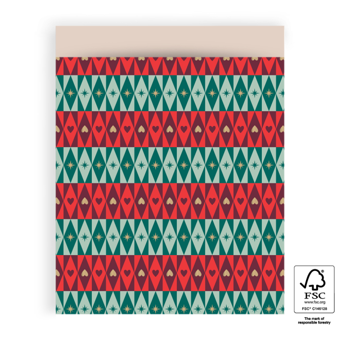 Add a festive touch to your gifts with these sustainable flat bags from House of Products. The flat bags come in various sizes and feature a beautiful graphic design in Christmas colours red and green, with subtle gold details. The beige interior completes the look with a warm feel. Made from FSC®-certified paper, these bags are an eco-conscious choice. Ideal for retailers and online shops seeking stylish and environmentally friendly packaging solutions for the winter and Christmas season.