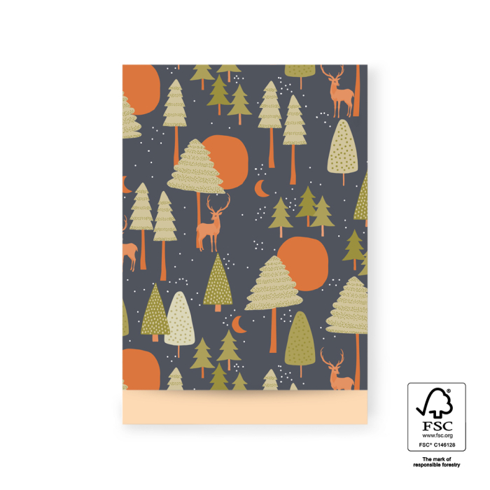 Wrap your gifts naturally and stylishly with these flat bags from House of Products. The flat bags come in various sizes and feature a charming design of trees and deer in dark blue, cognac, and olive green. The soft peach interior adds a warm touch. Made from sustainable, FSC®-certified paper, these bags are perfect for retailers and online shops seeking eco-friendly packaging. Present your products in a stylish and environmentally conscious way with these flat bags.