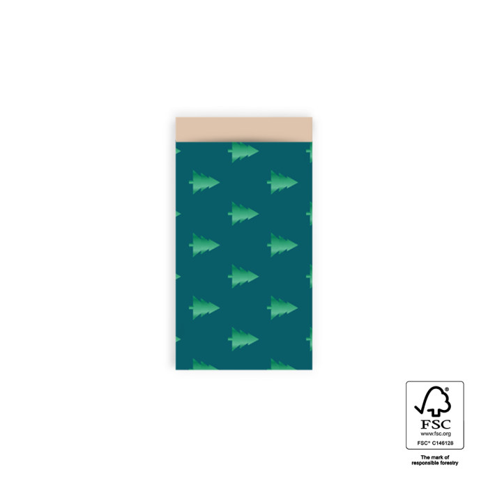 Add a touch of style to your Christmas gifts with our trendy gift bags from House of Products. These flat bags come in various sizes and are made from foil paper. They feature a festive design with green metallic Christmas trees on a dark jade green background. The nude-colored interior adds an elegant touch. Perfectly paired with our stickers and ribbons for a complete gift package. House of Products is a sustainable and FSC®-certified company providing high-quality packaging solutions. Wrap your gifts eco-friendly and stylishly with these unique Christmas gift bags.