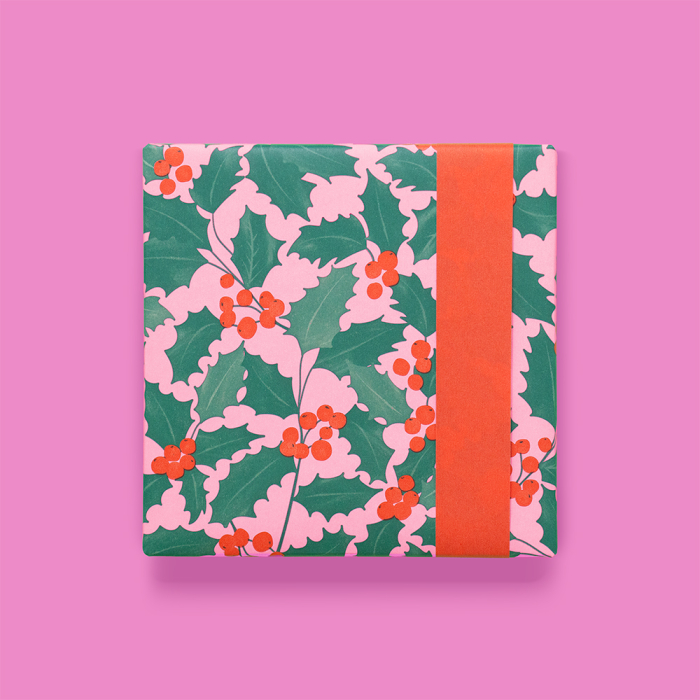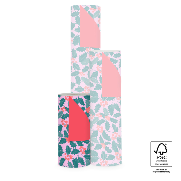 For your store, we offer a stunning 150-meter counter roll of wrapping paper. This natural wrapping paper is fully printed with green holly leaves and occasional red berries. The pink background adds a playful touch to your gift packaging. With a red reverse side, this wrapping paper is perfect for the holidays. Order now from House of Products, a sustainable and FSC®-certified company providing premium wrapping paper to retailers and online stores.