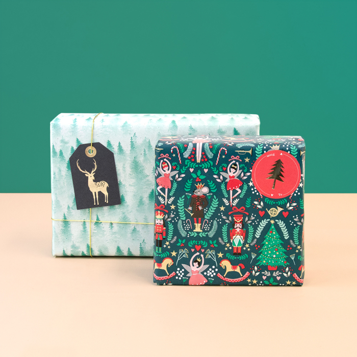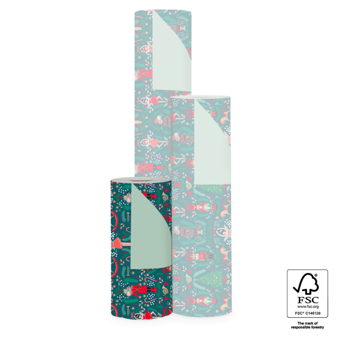 Add a festive touch to your gift wrapping with this beautiful Christmas wrapping paper by House of Products. The 150-metre counter roll features a classic design of the Nutcracker and Mouse King, with elegant gold, green, and red details on a jade green background. The light green reverse side completes the look. FSC®-certified and sustainably produced, this paper is ideal for gift shops and concept stores looking to wrap in style during the holidays. Pair with ribbons and stickers for a complete festive look. A perfect choice for eco-conscious retailers.