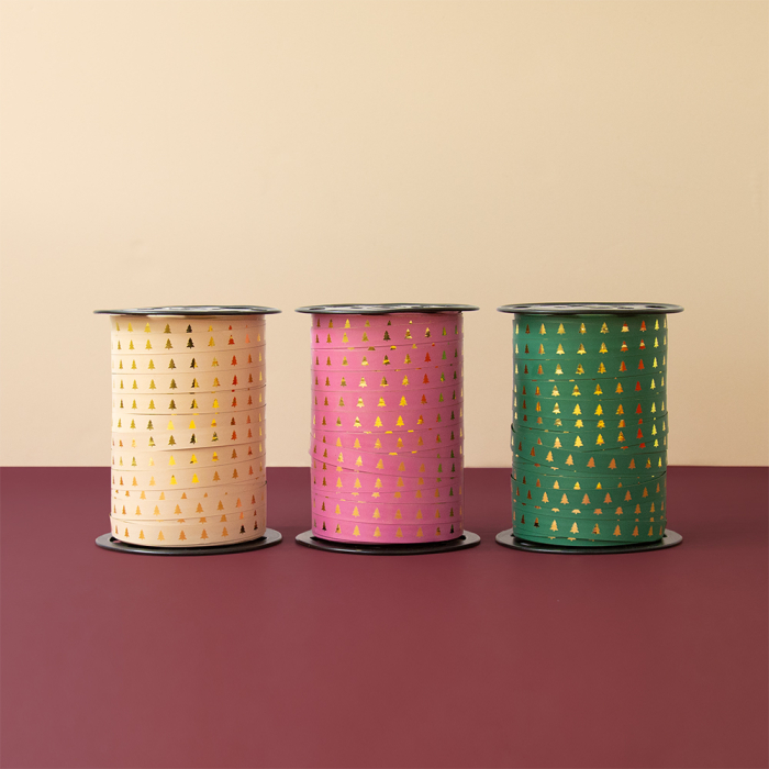 Add a cheerful Christmas touch to your gifts with our Paporlene ribbon with Christmas tree motif in bright pink and gold. Perfect for combining with our Christmas wrapping paper. This ribbon offers many festive possibilities with a length of 180 meters. The Paporlene ribbon is delivered on a black spool made from recycled material.