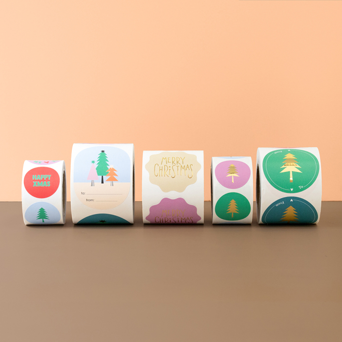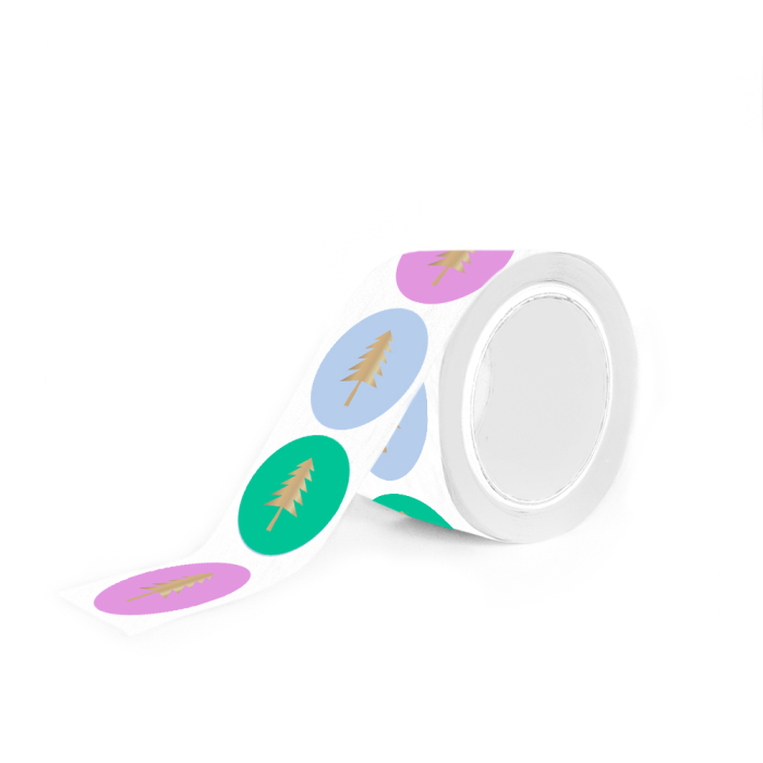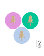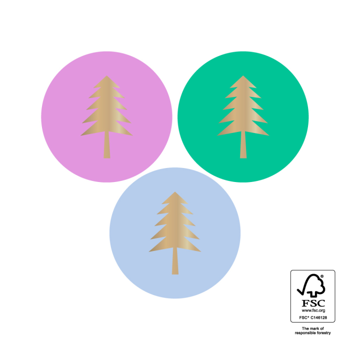 Add a touch of sparkle to your Christmas gifts with these X-mas Stickers Multi - Modern Tree Gold - Bright. The roll contains 250 stickers (Ø 35 mm) featuring three stylish Christmas tree designs in gold foil, in fresh pink, green, and blue colours. Perfect to give your Christmas packaging a chic and modern look. This product is fully FSC® certified, so you choose both style and sustainability. Ideal for shops and webshops wanting to make Christmas gifts extra special.
